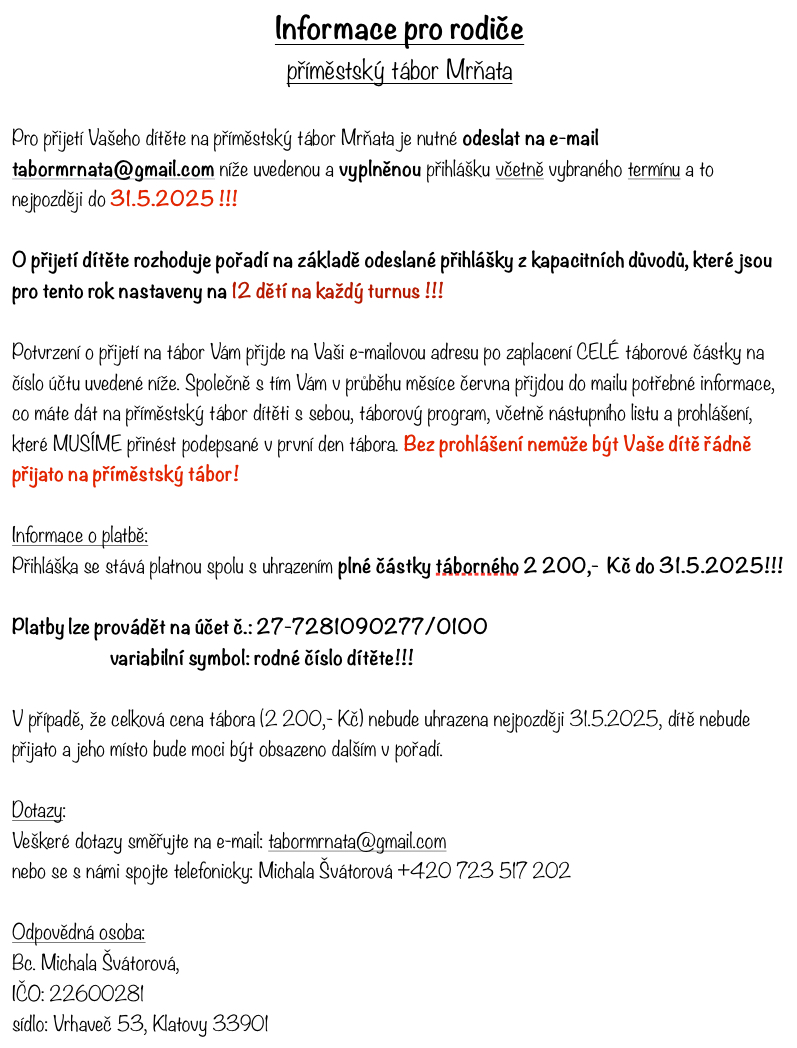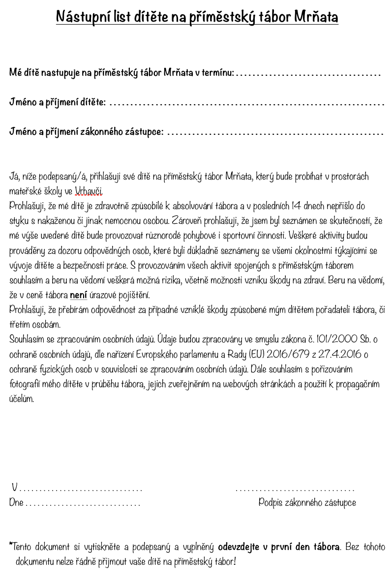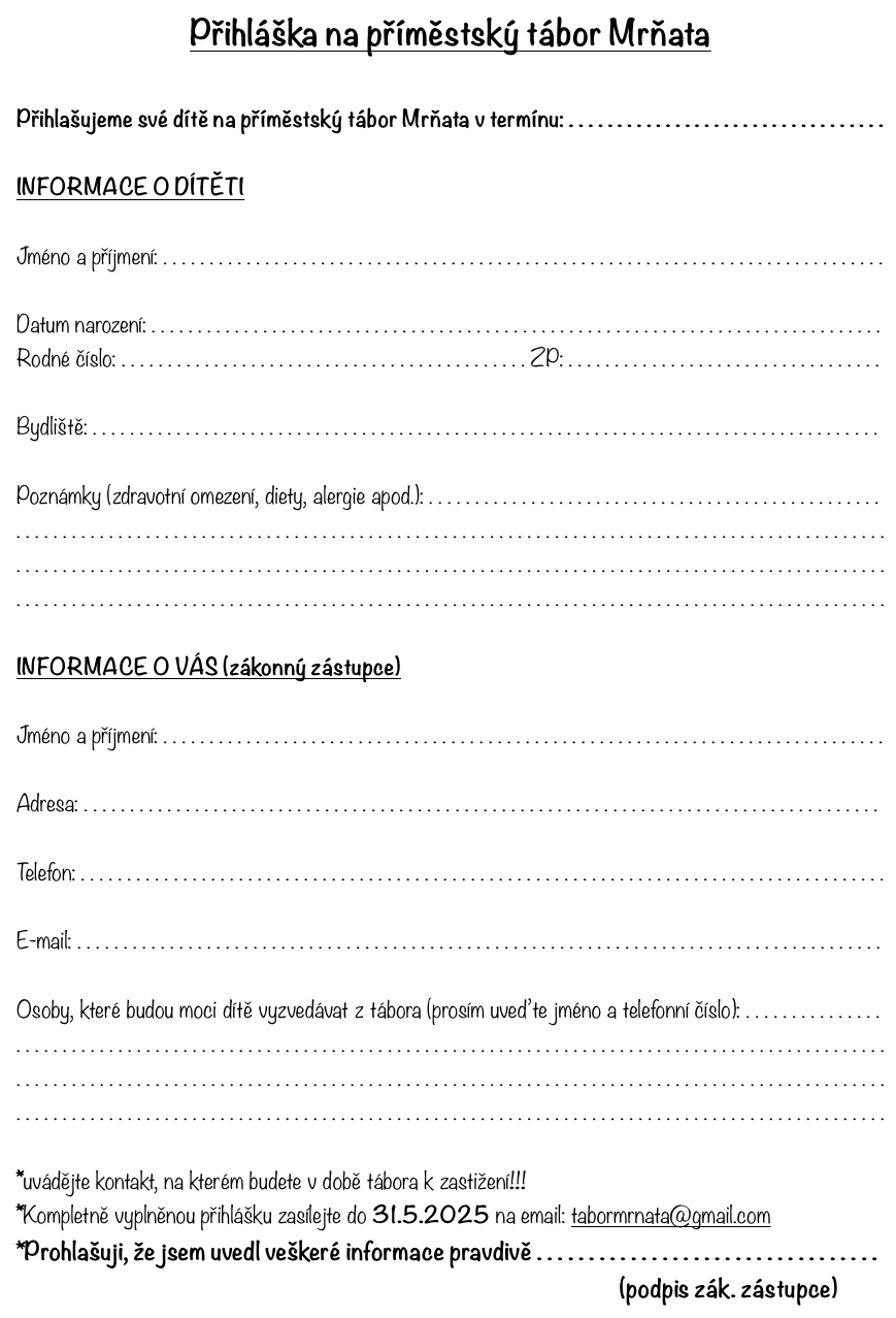 Pro přijetí Vašeho dítěte na příměstský tábor Mrňata je nutné odeslat na e-mail tabormrnata@gmail.com níže uvedenou a vyplněnou přihlášku včetně vybraného termínu a to nejpozději do 31.5.2025 !!!